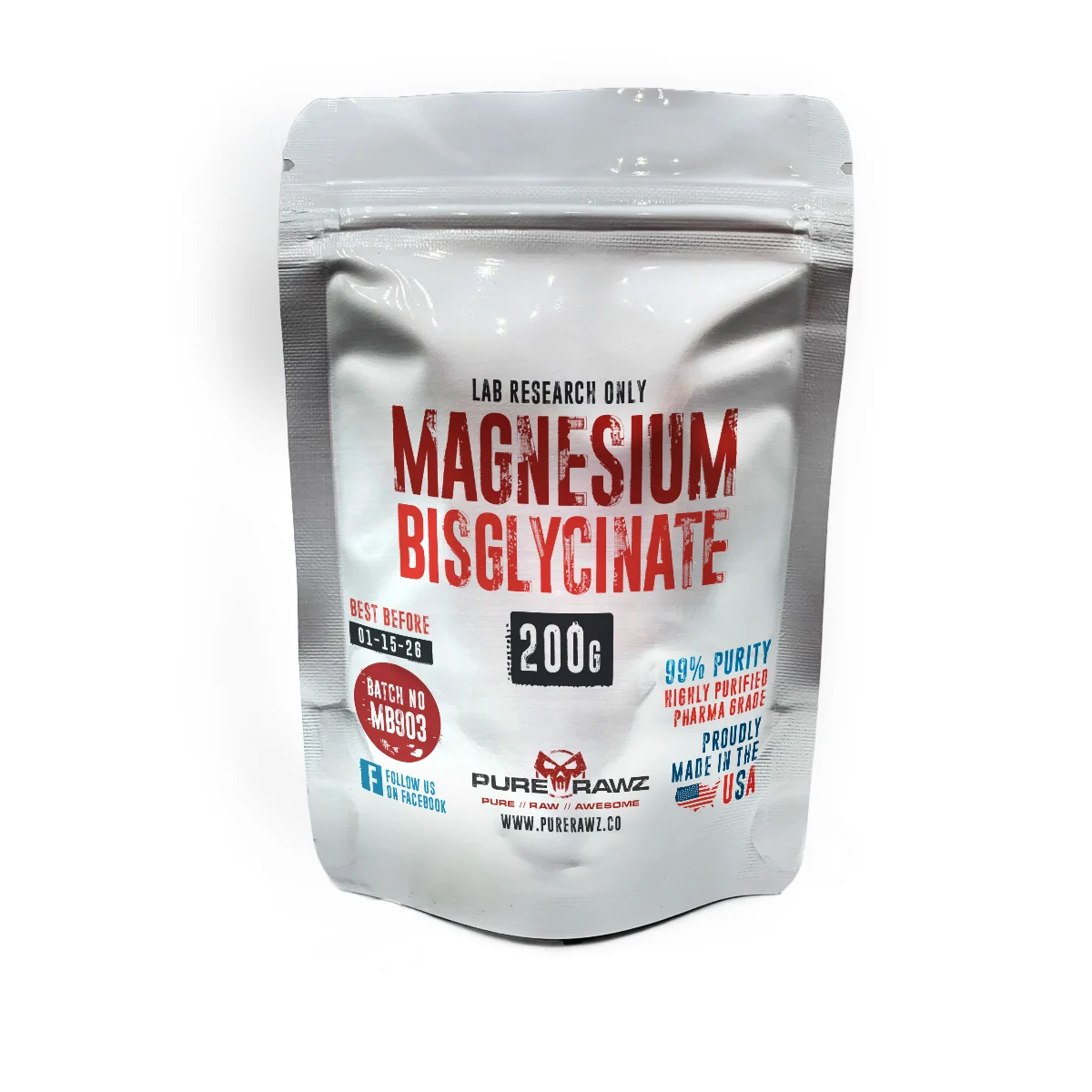 What is Magnesium Glycinate? Magnesium Glycinate is a chelated compound. It is made by combining magnesium with the amino acid glycine. Researchers study its potential role in cellular energy production. They also test it for muscle relaxation. It may play a role in nervous system function in lab subjects. This compound is intended for research purposes only. It is not approved for human or animal use. Chemical Properties IUPAC Name magnesium;2-aminoacetate CAS Number 14783-68-7 Molecular Formula C 4 H 8 MgN 2 O 4 Molecular Weight 172.423 g/mol Appearance White to off-white crystalline powder Solubility Moderately soluble in water How does Magnesium Glycinate work? Magnesium Glycinate may work in the following ways: Provides magnesium in a chelated form, which may enhance stability and absorption in lab models. Magnesium acts as a cofactor in over 300 enzymatic reactions; Magnesium Glycinate provides a source of magnesium for such studies. Supports ATP production, which is the main source of cellular energy. Plays a role in protein synthesis, helping cells build essential proteins. Supports nerve transmission, which helps signals pass between cells in lab subjects. These mechanisms are based on early research and are not yet confirmed. More research is needed to determine whether it works in lab models. What are the potential benefits of Magnesium Glycinate? In laboratory studies, Magnesium Glycinate may: Support energy production in experimental models Help with nerve signaling and muscle function in lab settings Lower oxidative stress in research subjects Shown potential effects on sleep and relaxation in test models Provide insights into stress and the nervous system in lab models Note: This compound is intended for research purposes only. It is not approved for human use. Research on Magnesium Glycinate Preclinical studies show that Magnesium Glycinate may be absorbed better than other magnesium salts. Research models suggest it may influence metabolic health, bone density, and neurological function. However, research on this compound is limited. Some preliminary clinical studies suggest potential effectiveness, but more evidence is required. Where to buy Magnesium Glycinate online for research purposes? If you are looking to buy Magnesium Glycinate for laboratory use, PureRawz provides high-quality reference materials. Each product comes with a Certificate of Analysis for verification of purity and concentration. Note: In the Nootropics Powder category, PureRawz offers lab-tested formulations including Nooglutyl , Theacrine and many other product. Is Magnesium Glycinate legal? Yes. Magnesium Glycinate is legal for research purposes. It is not approved by the FDA for human consumption. Further studies are required to understand its effectiveness. FAQs Is Magnesium Glycinate safe for human use? No. Magnesium Glycinate is for research purposes only. It is not approved for human or animal consumption. Are there any side effects of Magnesium Glycinate? Magnesium Glycinate is still being investigated. Potential side effects are not well established and require further research. More studies are required to confirm its safety and efficacy. How should Magnesium Glycinate be stored? Store in a cool, dry place, away from sunlight. Keep sealed until use in a controlled laboratory setting. What is the shelf life of Magnesium Glycinate? The shelf life of Magnesium Glycinate is typically up to 2 years, but may be extended with proper storage. Disclaimer This information is for educational purposes only and not medical advice. Products are for research use only. Research must follow IRB or IACUC guidelines. Verify information independently before purchasing. By ordering, you agree to our Terms and Conditions . If you are not 100% satisfied with the product you received, please contact us at support@purerawz.co ATTENTION: All our products are strictly for LABORATORY AND RESEARCH PURPOSES. They are not intended for human or veterinary use.