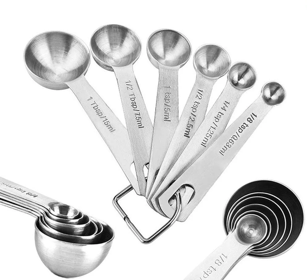 This is a 6-piece set of stainless steel measuring spoons. Spoons Sizes: 1. 1/8-Teaspoon = 0.62ML 2. 1/4-Teaspoon = 1.25ML 3. 1/2-Teaspoon = 2.5ML 4. 1-Teaspoon = 5ML 5. 1/2-Tablespoon = 7.5ML 6.1-Tablespoon = 15ML Not sure how to pay? Follow this link for our easy payment instructions.