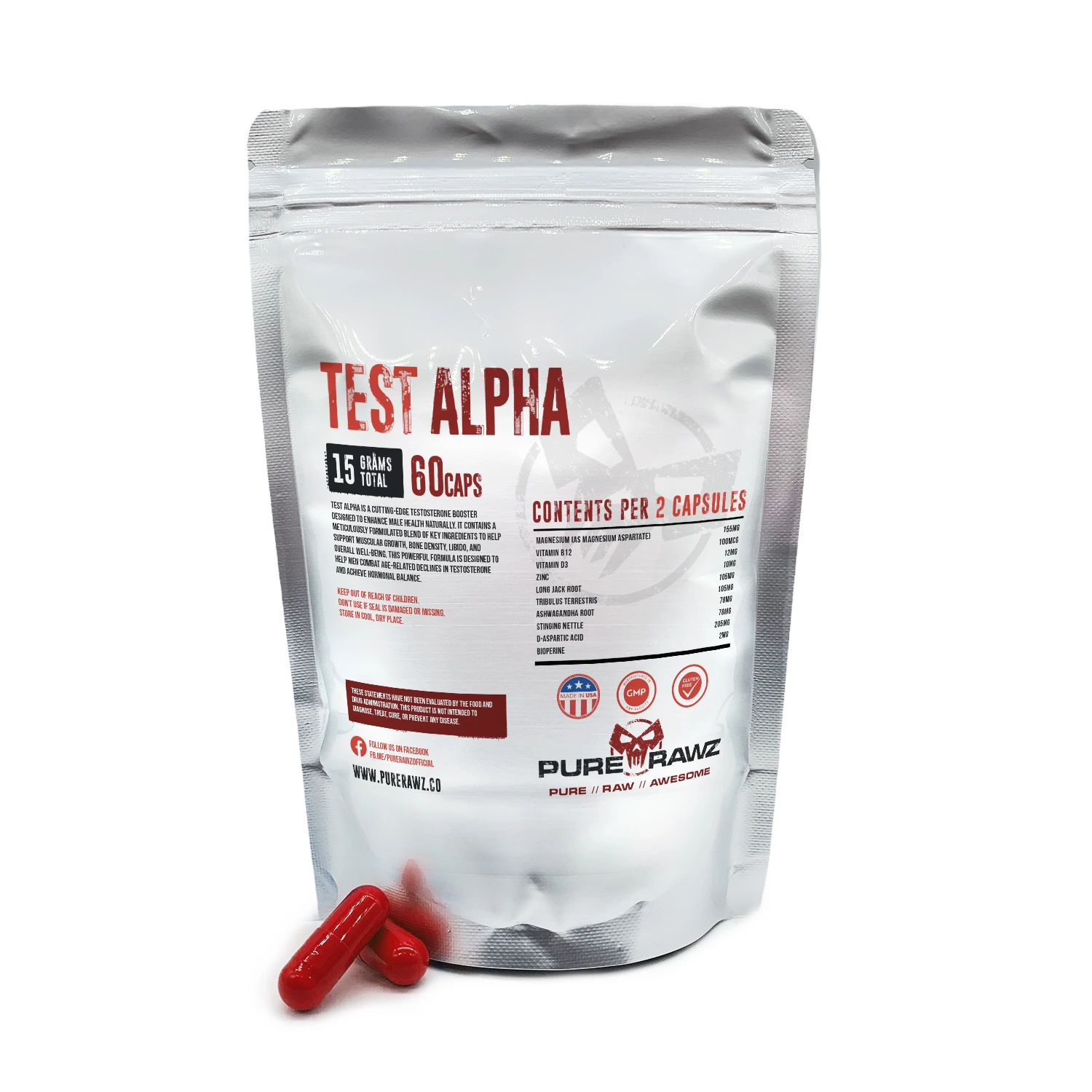 Test Alpha Many research labs are studying how natural vitamins, minerals, and herbs affect testosterone in test subjects. Test Alpha is a research compound from PureRawz that may contain positive ingredients needed for research. The name “Alpha” relates to testosterone, a hormone studied for muscle function, mood, and energy. Each resealable pack contains 60 capsules (30 servings). Ingredient Amount Magnesium (as Magnesium Aspartate). 155 mg Vitamin B12. 100 mcg Vitamin D3. 12 mg Zinc. 10 mg Long Jack Root (Tongkat Ali). 105 mg Tribulus Terrestris. 105 mg Ashwagandha Root. 78 mg Stinging Nettle. 78 mg D-Aspartic Acid. 205 mg Bioperine (Black Pepper Extract). 2 mg How Test Alpha Works? Test Alpha may work in a few ways: Hormone Support Pathway: Zinc, magnesium, and D-aspartic acid may influence hormone balance and production in animal studies. Protein Synthesis Support: Some ingredients may help test subjects maintain muscle structure. Energy and Recovery Regulation: Ashwagandha and Tongkat Ali have been seen to help regulate stress and energy metabolism. Research Applications Researchers may use Test Alpha to: Study how nutrients affect testosterone-related activity in animal or cell models Measure strength and recovery indicators in test subjects. Observe effects on oxidative stress and metabolic function. FAQs Does Test Alpha increase nitric oxide? Not exactly. But some tests show that herbs and minerals inside are studied for blood flow support, which may also affect nitric oxide levels. How long does it last? Please check the product label. It’s best to use it before expiration. So it’s still fresh, and the research quality is good. Are there any side effects to it? Yes. In some cases, like headache, acne, or a change of mood. Disclaimer The purpose of this information is for educational use only. Products like Test Alpha are not for human or veterinary use. All research should follow proper ethical and laboratory guidelines (IRB / IACUC). Want more details? Message the support@purerawz.co